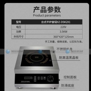 臺式平爐旋鈕XZ-DSK2X1,商用智能電磁爐3500W大火力、節(jié)能省電、聚能加熱。您需要一臺經(jīng)久耐用的好電磁爐不銹鋼材質(zhì)加厚不銹鋼架構(gòu),穩(wěn)定耐用,不易生銹,耐腐蝕,易清潔,干凈省事。